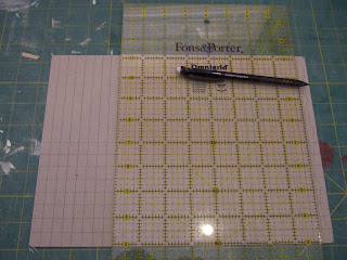 I also looked at the pictures I have of the original Pickett Hill house that I am copying, and it seems to use individual ridge tiles. So I decided to go with those. I used my quilting ruler to mark up thin card (from the back of a writing pad) into strips 3/8" wide (roughly the width of a narrow shingle) and 1/2" long (to overlap 1/4" on either side of ridge). Before cutting these out, I scored a line halfway along the length, so that each shingle would have a fold line.